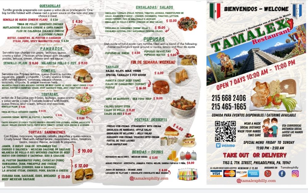 Tamalex Restaurant, located in Philadelphia, offers a fusion of Honduran and Mexican cuisine. With a variety of options, including vegan and vegetarian dishes, the menu caters to diverse tastes. Customers rave about the delicious entrees such as pambazo, steak enchiladas, and cabeza tacos. The portions are generous, ensuring satisfaction with every meal. The authentic flavors and friendly service create a welcoming atmosphere, making it a neighborhood gem. The extensive menu features appetizers like choriqueso and guacamole, as well as traditional dishes like huevos rancheros and chilaquiles. Tamalex Restaurant stands out for its quality food, affordable prices, and impeccable presentation. Whether you're a fan of Mexican cuisine or looking to try something new, this restaurant is a must-visit.
